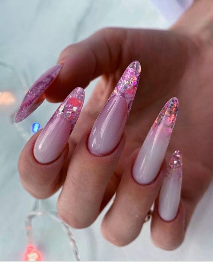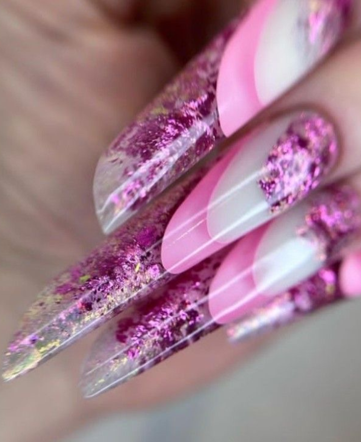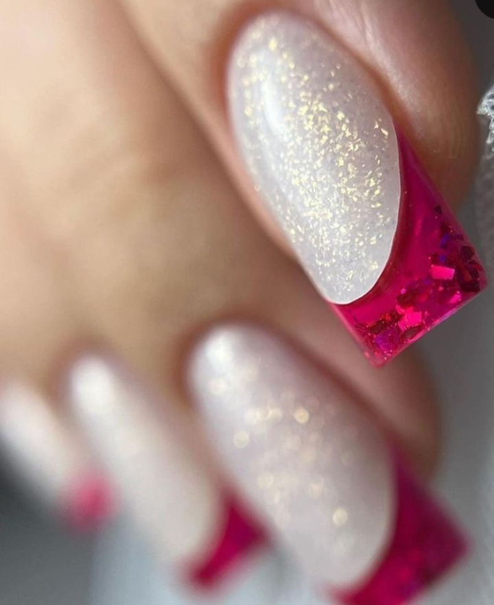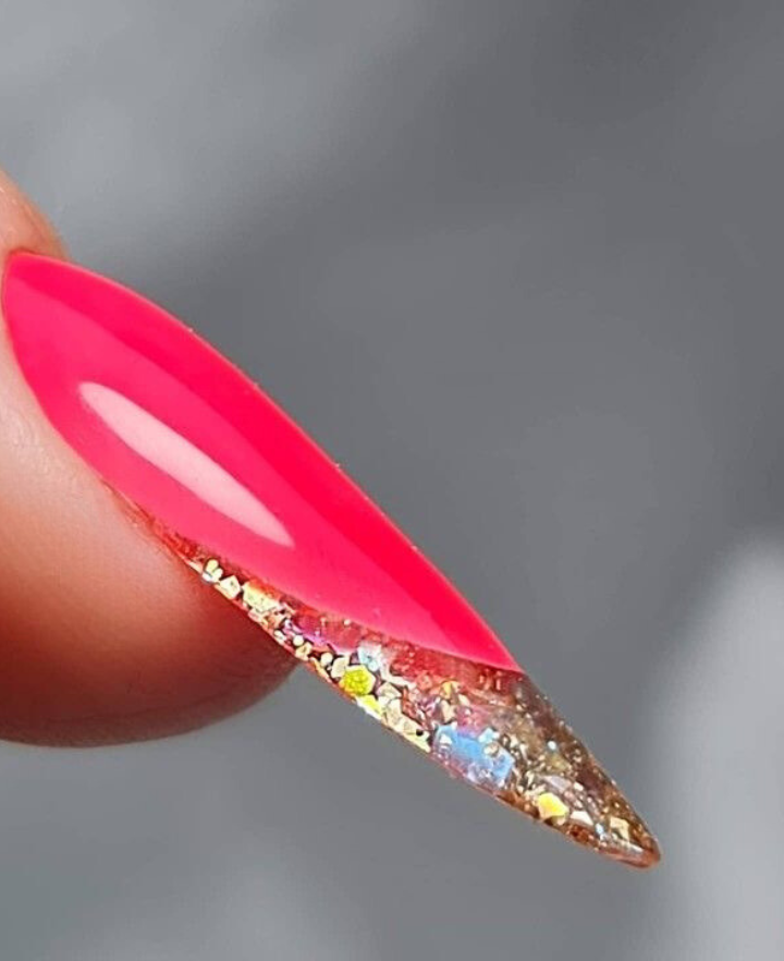The French tips are very classy, but their style is also very contemporary, ombre design. The two effects are switched from milky white to solid pink and the whole thing is covered with a layer of rainbow glitter which seems to be very expensive and beautiful. It’s a chic style that you can wear on a special day like Valentine’s Day or you can wear it any day with glam.