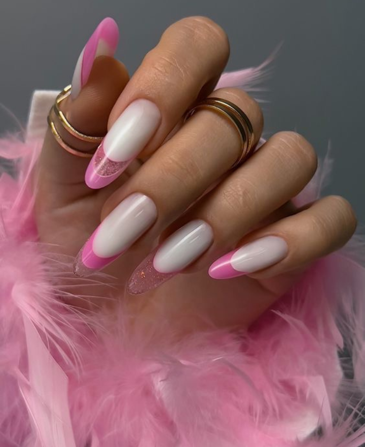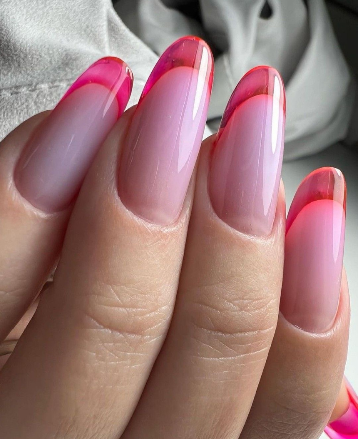 This design incorporates a chic milky pink base that significantly changes to a neon pink splash on the tips, thus creating an original take on the traditional French style. The oval shape is both functional and stylish, making it ideal for infusing any outfit with a little bit of fun and a lot of elegance.