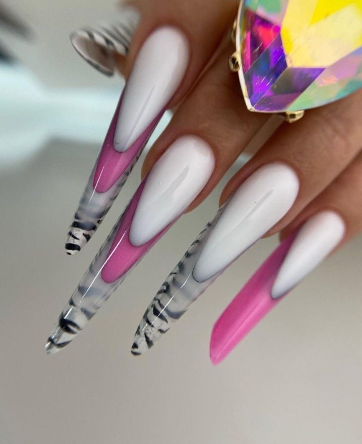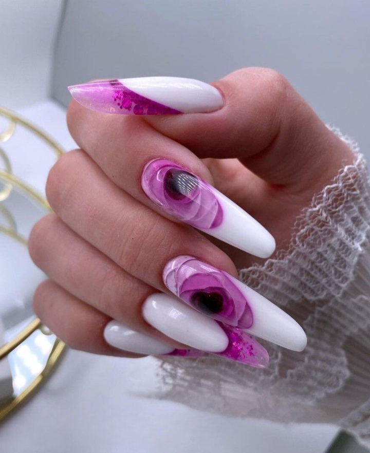 These nails are amazing representation of the art of nail design, that is, solid white and pink swirls that create something like marble or a blooming flower. This design is an excellent choice for those who like simple sophistication with creativity and can be used both by the short and long-nailed.