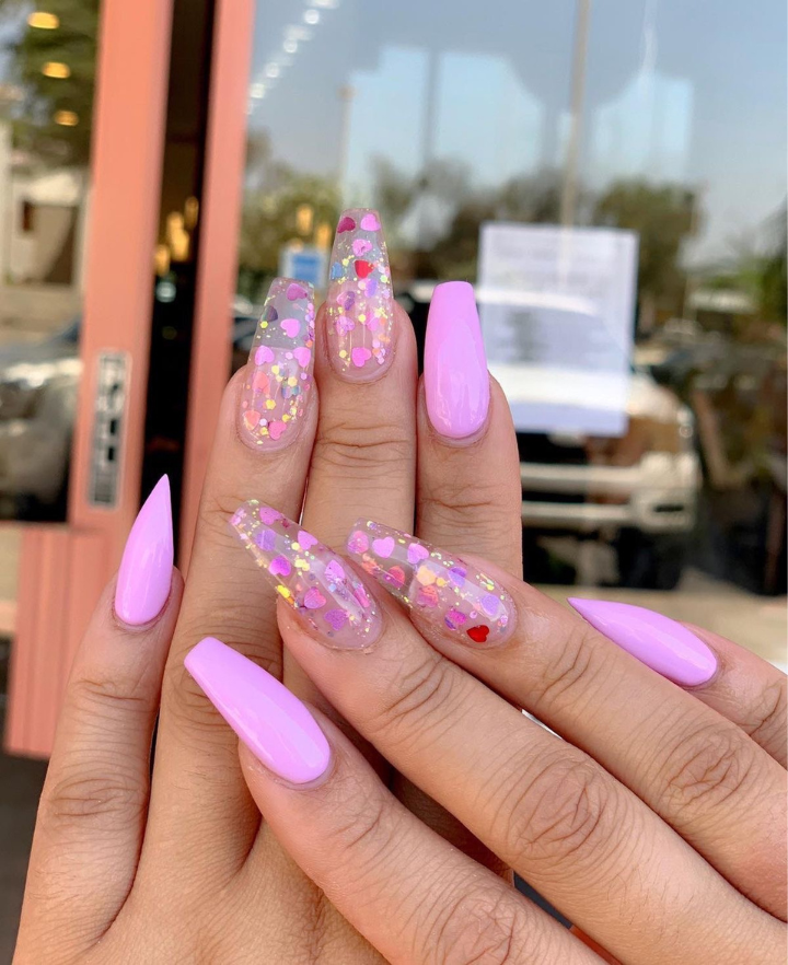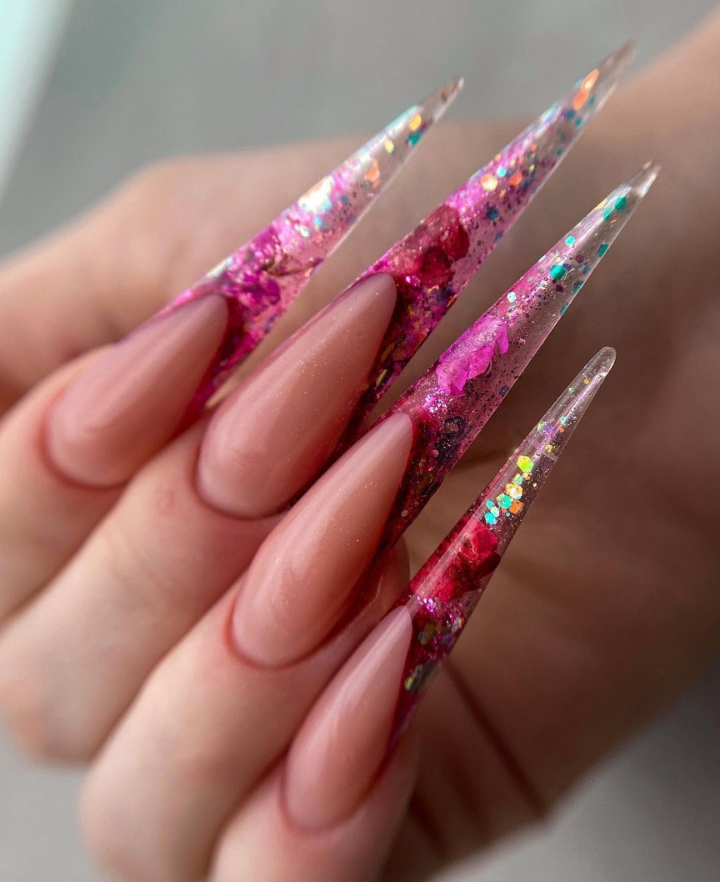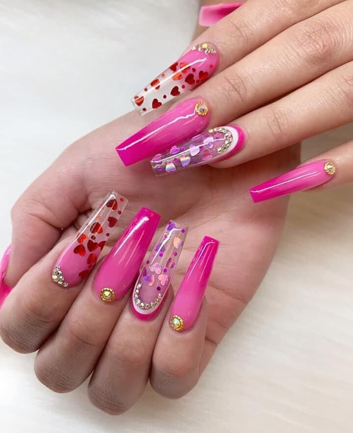 The long coffin-shaped nails are quite confident with the addition of vibrant pink. These are a great choice for anyone that wants to be bright and bold thanks to the clear panels and strategic crystal placements.
