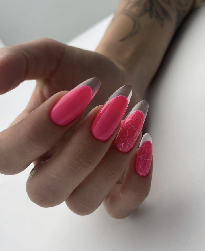 This design grabs attention with its bright bubble gum pink, which is the central feature, and this makes it a great option. In some fingers, the almond-shaped nails are made special through the addition of a white, unique, transparent pattern on the base which shows a cute and creative idea. This design is suitable for the lady who has the joy of mixing eye-catching colors with artistic skills, thus creating a fabric that is both playful and chic.