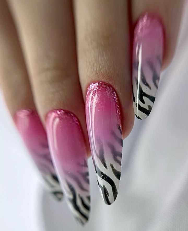 This nail design exemplifies the style of a trendsetter interested in flipping the cute side of things into an edgy one. The pink color mixes with a courageous zebra pattern for the visual excitement of the dynamic and bright. The elongated nails are the best platform for this drawing, they prove that pink is a cute thing that can be scary too.