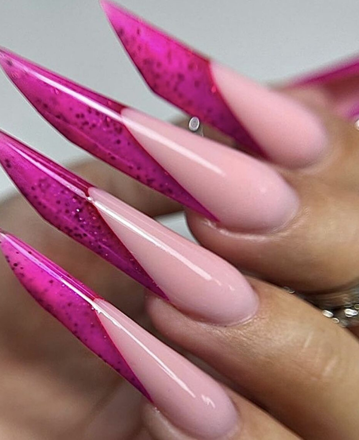 If you have always been a confident individual and love to wear and show your personal style with bold colors that come with your favorite designs, then you will definitely like these hot pink nails. The bright and stunning pink shade is sprinkled with black that not only makes the design very unique but also gives it a modern and daring look. The stiletto style of the nails only adds to the general effect of the bright color and this way it becomes a perfect choice for the lady full of confidence and who likes to be a trendsetter.