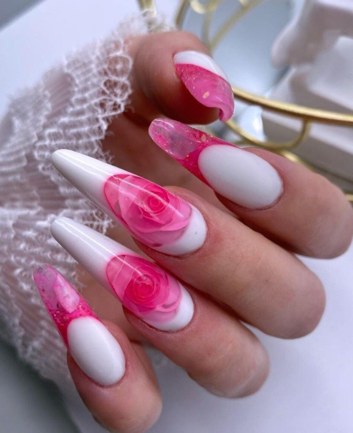 This is a mystical variant of the traditional French manicure, these nails sport a combination of white and milky pink, with a beautiful rose design on the tip in a translucent pink color. The oval nails are the charming backdrop for the masterpiece, thus making this design a token of the creativity thatResult of AI in acrylic nails.