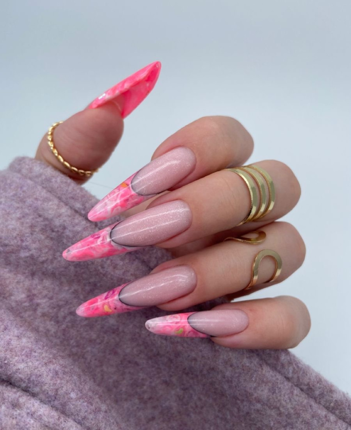 This is a classic instance of showcasing art on the tiniest of surfaces. The background is a light base that features a complex black and neon pink marbled design. The coffin nails are designed as such, which are set to be art of wear, and will also attract eyeballs and are perfect for a bold clothing style.
