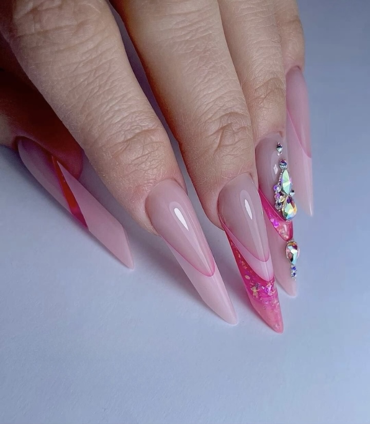 These long nails are the perfect combination of love and luxury which is otherwise called the norm. The nail type chosen for the highlight is coffin shaped. This nail is designed in such a way that it resembles the coffin. The huge amount of sparkling crystals used on dress and the designs that she introduces here are perfect for a luxurious party. One can also use them to enrich one’s daily routine with an extra hint of luxury. The design makes one feel and look beautiful in pink that’s why it reveals the luxuriousness of the style.