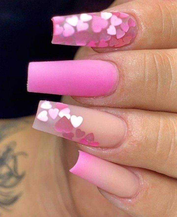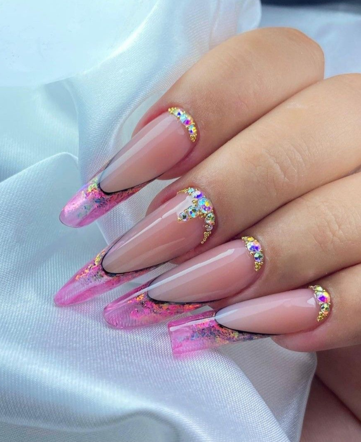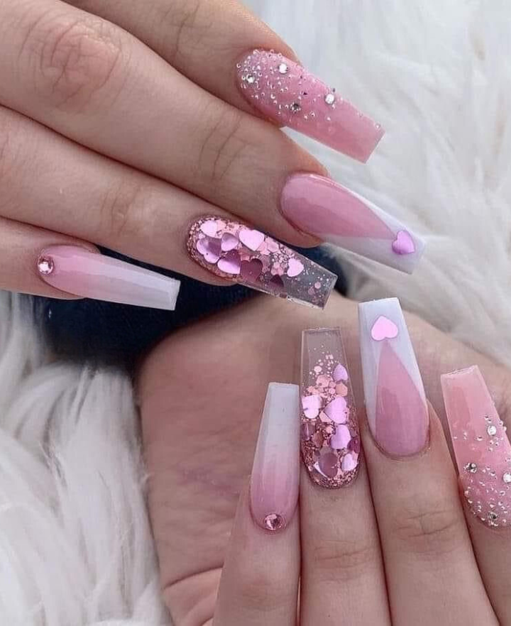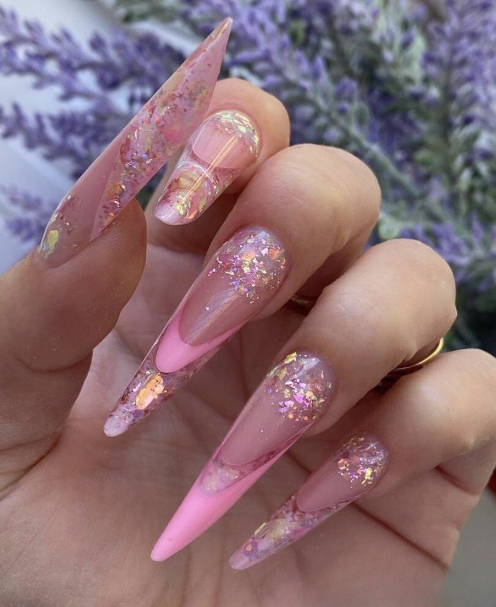 Coffin nails that are long and striped with alternating hues of milky and bubble gum pink, decorated with glittering gold flakes, are the eye-catcher for this design. This design is ideal for the girls who have a strong preference for the pink colors combined with sparkling and sophisticated colors. This elegant look can be seen in the beautiful and bright colors that go well with the office during the day and the cocktail party at night.