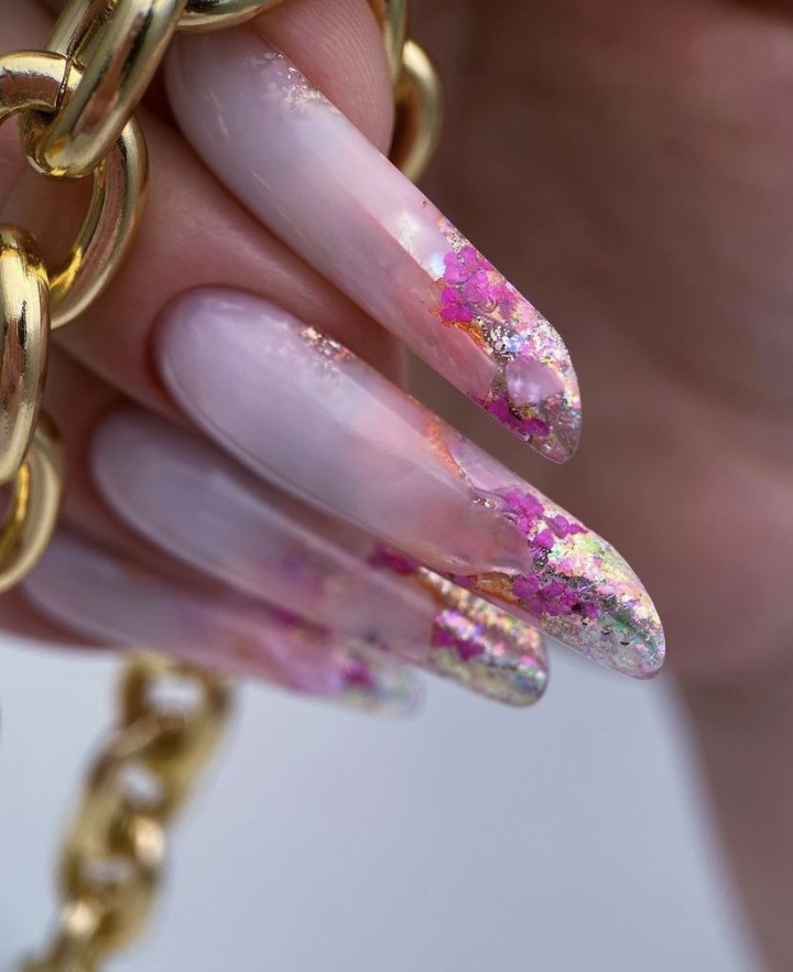 The nails here are originally pink that naturally change into a cosmic design full of gold flakes. This design symbolizes the uncomplicated beauty of a dawn sky and uses both solid and see-through finishes to put together a look that is both subtle and captivating.