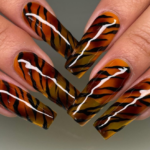 The fingertips that announce you are a provocateur! Black with a splash of hot pink is the daring combination of colors that makes them pop even more. The application of animal print detailing is the ultimate edge. Therefore, this design speaks to the true fashionista and not just any woman but the one with a kick to it.