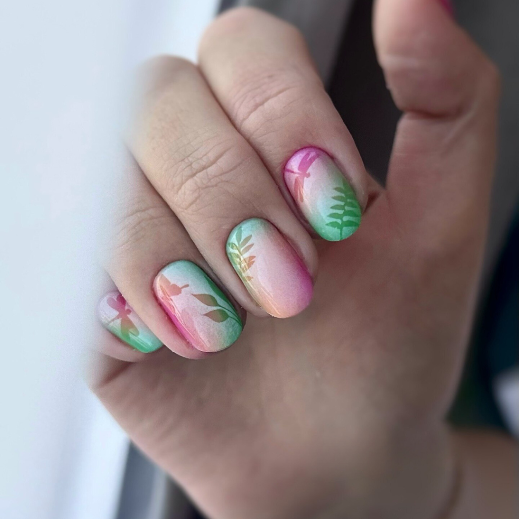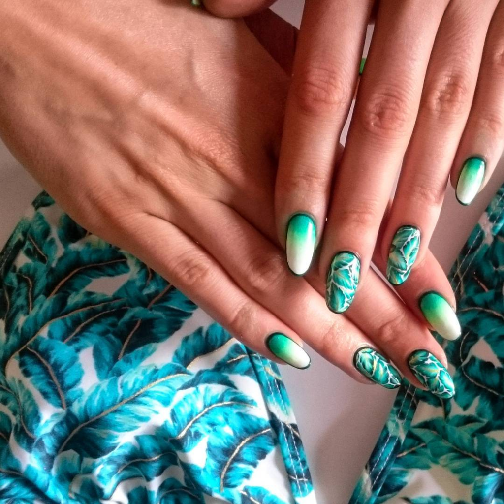 This eye-catching green gradient design is the right choice for anyone who is into nature-inspired looks. The gradual change from a pale green to a deeper shade is truly the inclusion of the freshness and liveliness of your creation. The additional leaf patterns give the design that more summer or tropical holiday touch of creativity. The shades of green used here promote the thoughts of freshness and liveliness of nature and result in a look that is both stylish and exceptional.
