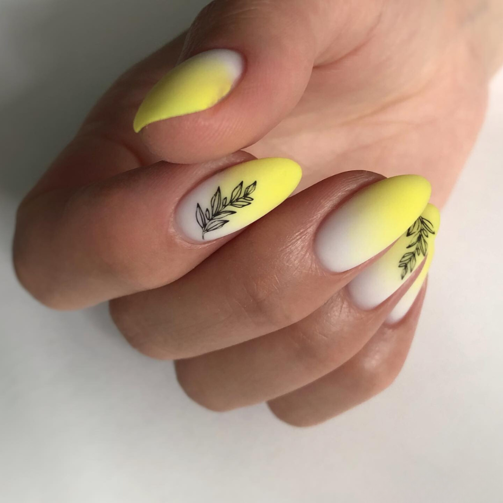 The way you look can be complemented by adding this bright yellow and white gradient design to your day. A joyful and bright look is initiated through the gradual blending of white with yellow. The light leaf motif that is presented in black is not only idyllic but also elegant, thus this design is equally applicable in formal and informal settings. The color yellow radiates warmth and energy, which is why your nails will always be the center of attention.