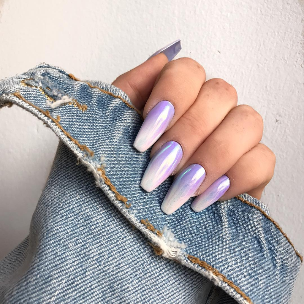 This is a mind-blowing holographic gradient design that futuristic technology can do. It blends purple and white for an entrancing effect. The shiny iridescent finish presents a new and modern twist to the basic gradient, making your nails look like from a science fiction movie. The purple tones along with the holographic glitter result in a bright and attractive appearance that is ideal for people who want to draw attention.