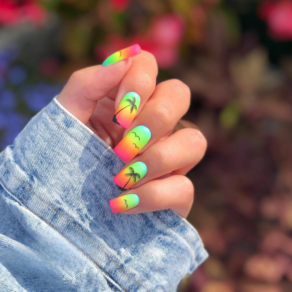 Prepare for a beach vacation with the tropical sunset gradient design. The bright shift from yellow to orange to pink, accompanied by black palm tree silhouettes, embodies the spirit of a tropical paradise. This aesthetic design is the best choice for summer holidays and is bound to turn your nails into the center of interest.