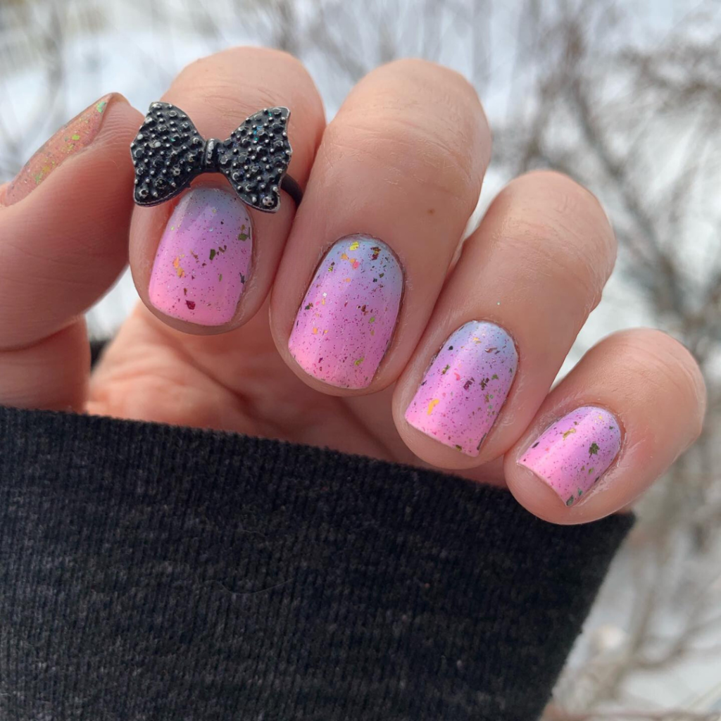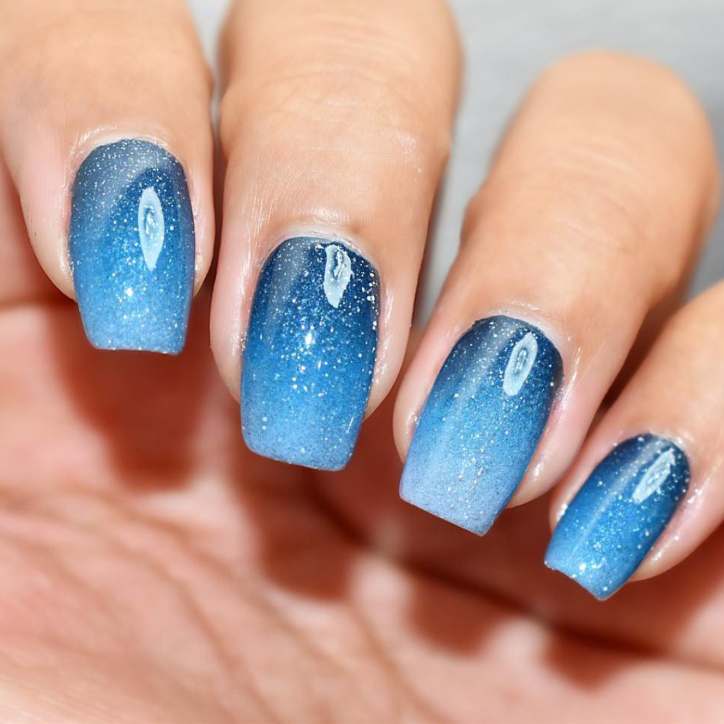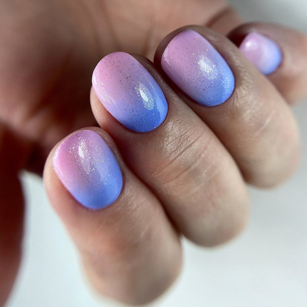 An iridescent gradient design that is stunning and features a transition from blue to pink. The addition of blue and pink colors creates a gentle and girlish feeling, while the sparkling iridescent surface brings the magic element to it. This design is ideal for the people who like to put a little glitter on their nails.