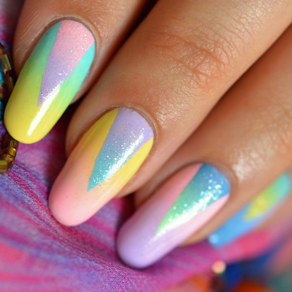 This geometric pastel gradient design is a cool and funky twist. The bright pastel colors and rigid geometric forms create a very impactful and aesthetic design. Spring and summer are the happy season for pastel shades, which bring fun to your fingernails. This design is for those confident and inventive in nail art.