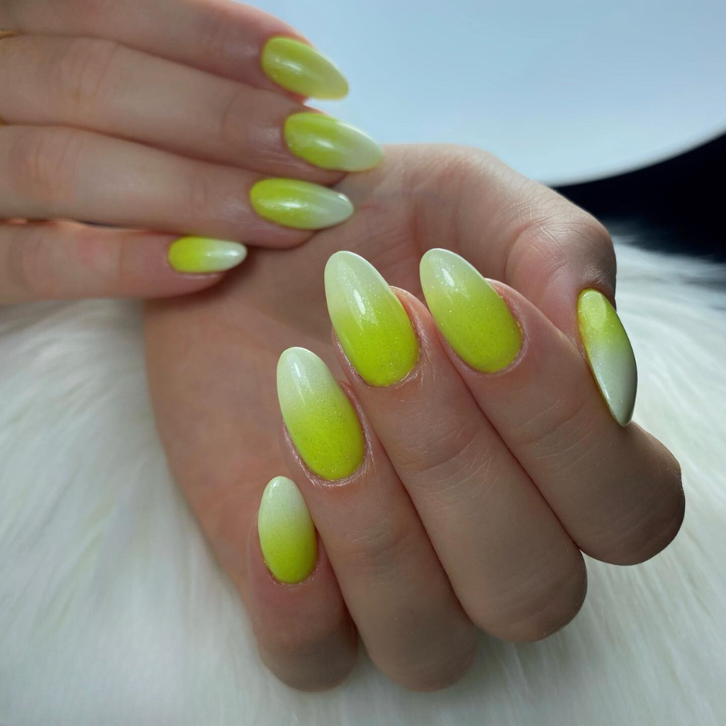The summer season is the suitable time for this interesting lemon green gradient design. The discrete view of white with lemon green, which makes it look full of energy and life, is achieved through transition. Green colors represent freshness and liveliness, and thus, the design is not only trendy but also gives off energy.