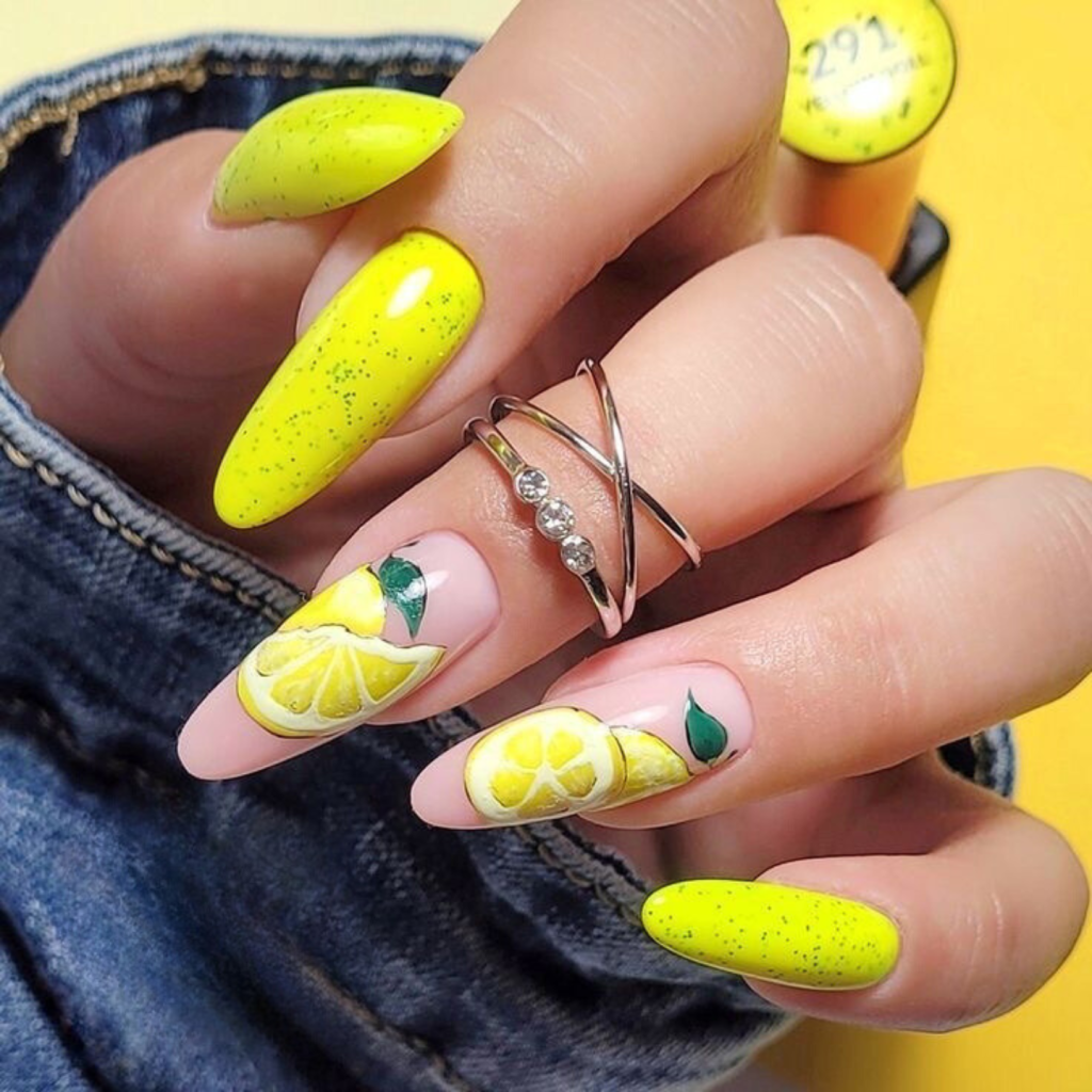 These nails are like a glass of antipyretic lemonade on a stunningly hot day, with their adorableness and playfulness. Bright neon yellow used in alternate form with soft pink is the base and these zesty lemon slices seem to attach to the nails from nowhere. The beauty of these designs made of acrylic is that they are a clever unison of the two shapes: the medium length and almond shape, making them an ideal choice for your favorite summer outfits. Besides, they are also excellent for adding a zesty twist to a plain denim look or for enlivening a basic white t-shirt with shorts.