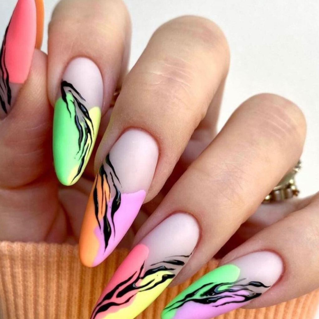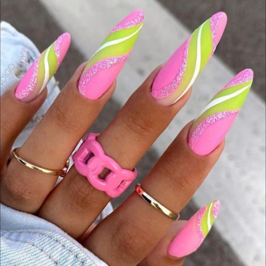 Neon nails that are splashed with electric color give a loud expression of summer fun and bold style. The vibrant combination of pink, white, and neon green with a touch of black makes a striking and playful combo, ideal for the woman who is not afraid to stand out. These nails are not only on-trend but also will break the ice any time and with them, you can rock a simple black jumpsuit or a cute tank top and jeans outfit.