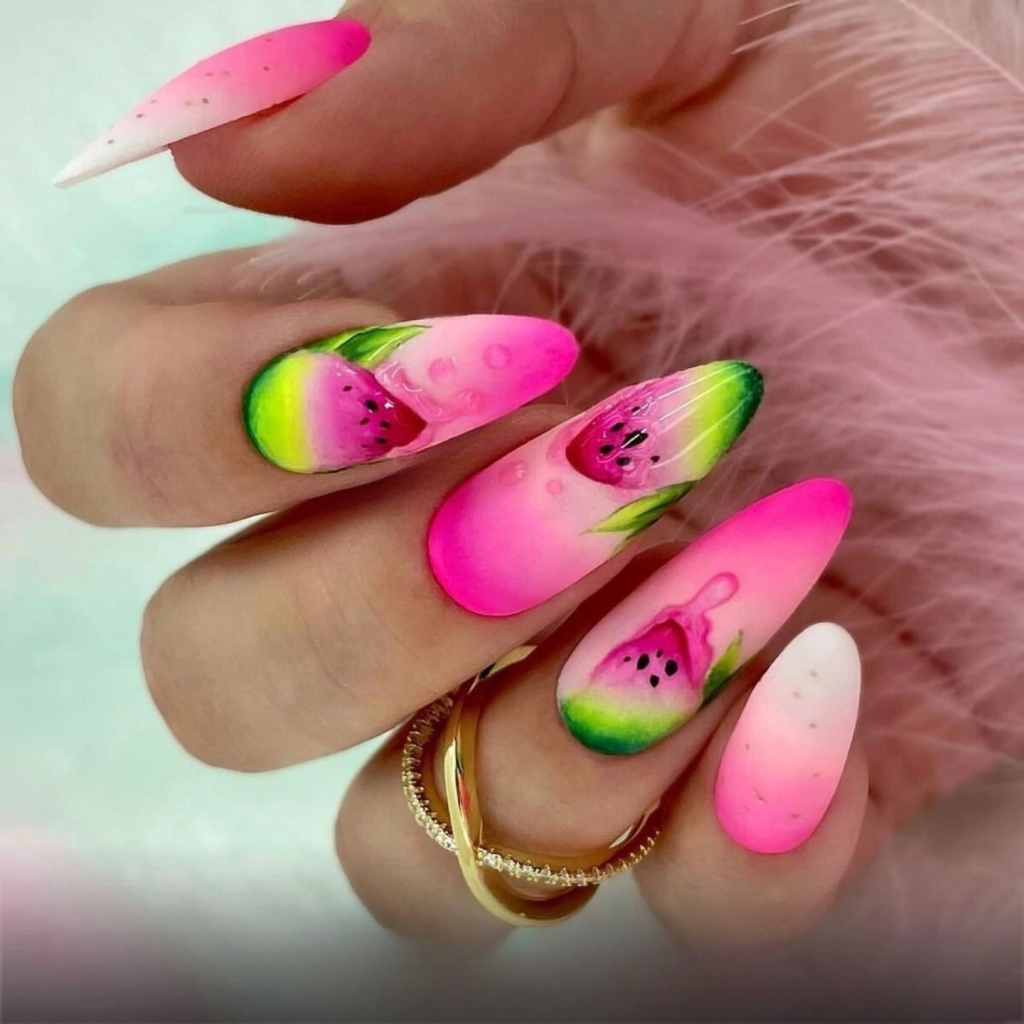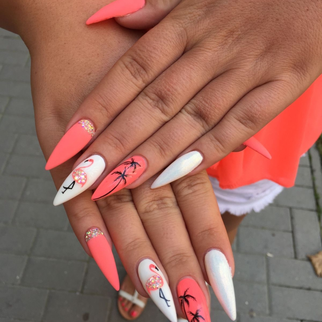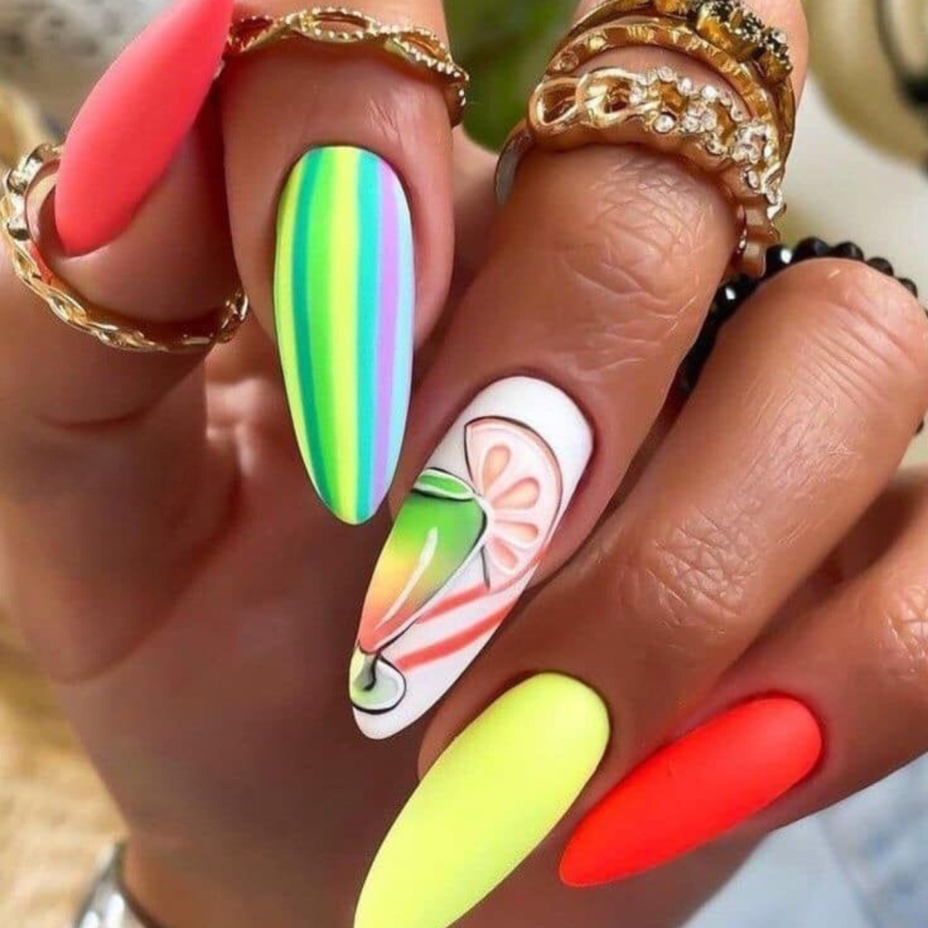 Why take only one color when you can have a rainbow? These long nails are a party of neon lines and citrusy slices that are like endless fun during summer. The designs are the combination of bright opposite colors and pretty small things, and they are just right for the brave ones. From a pool party to a summer festival, these nails will be a great match for an outfit that is as brave as the nails are-imagine a white tank top and neon accessories for a totally summer look.