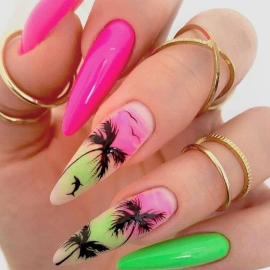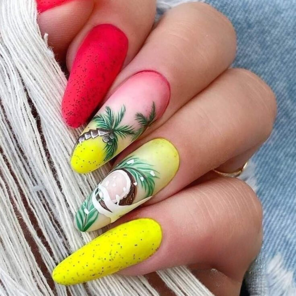 These nails with their palm tree design are like a tropical getaway fully realized, which is the soft sandy beach and the delicate balance of the palm trees under your fingertips. The combination of matte and glossy forms a design as colorful and various as a beachside environment. This inspiration is a perfect match with a light, maxi kaftan or an all-color summer dress, which is the ideal way to embrace the spirit of the 2024 beach holiday.