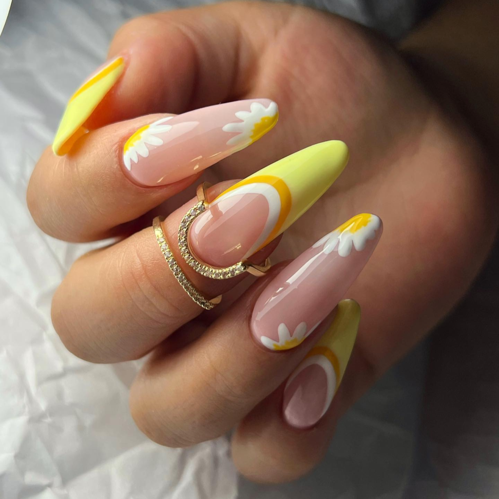 The bright yellow of these nails symbolizes hanging out on a sunny day. Happy yellow and daisy symbols give it a simple yet joyful design that celebrates the easy-going days of summer. They’re the real cute and casual inspo for a picnic or strolling in the park. With a light denim jacket and white sneakers, these nails will bring a touch of summer joy and simplicity to any outfit.