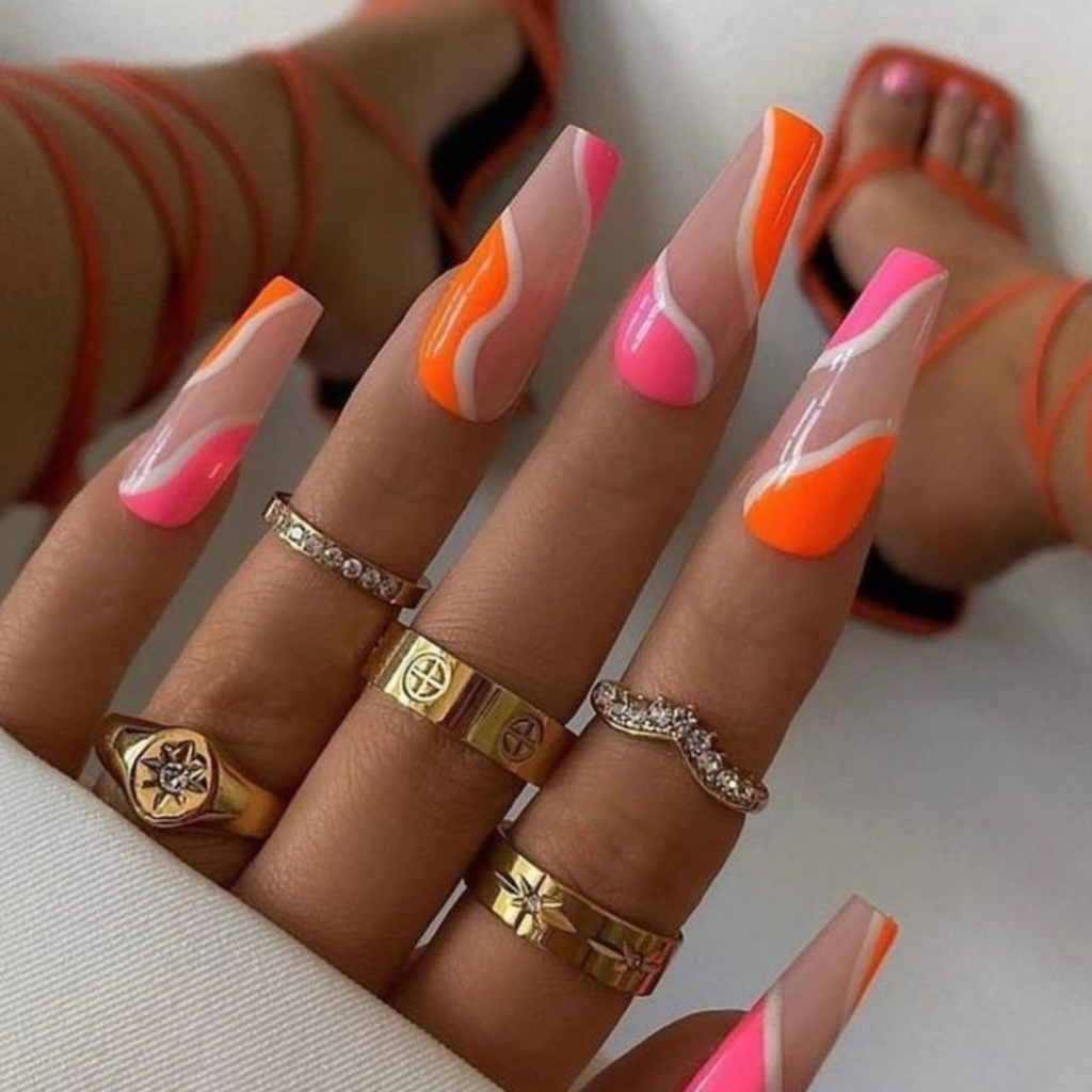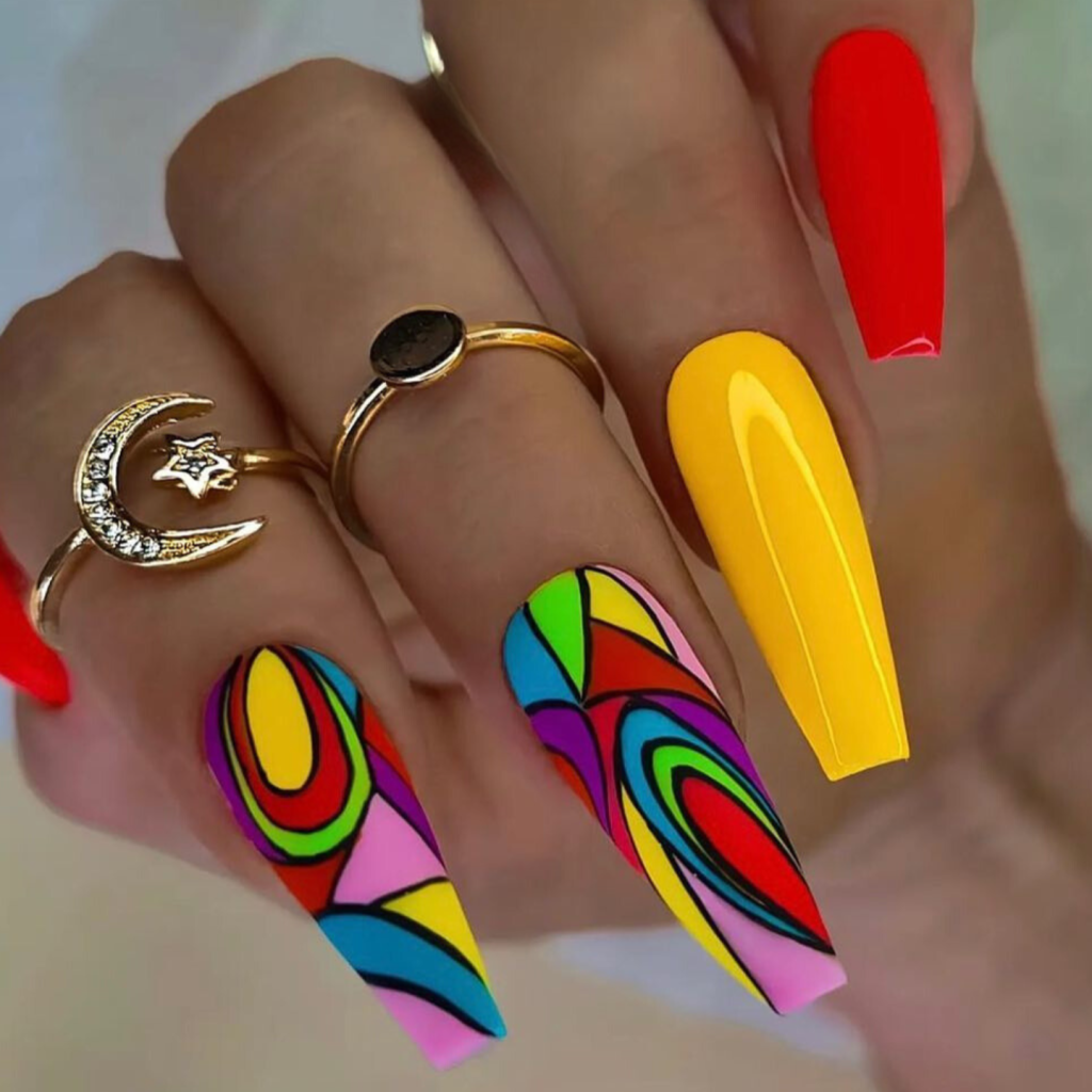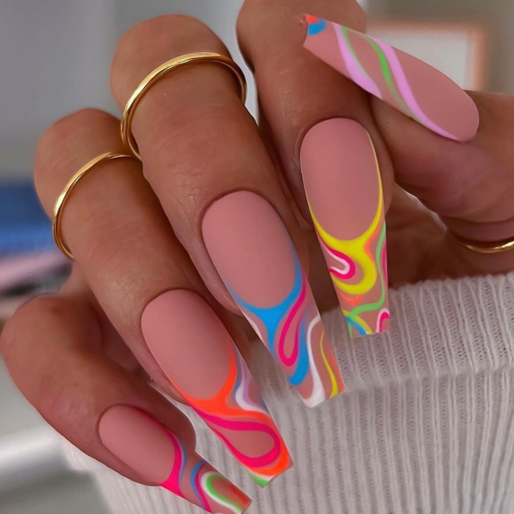 The nails, which are both gorgeous and exceptional, are truly a masterpiece with their eye-catching colors and multi-colored swirls. The designs, which are in summer’s colors, are a brave and artistic representation of what you like and how you dress. Who would not look fashionable and stand out with these nails at the music festival or laying by the pool drink cocktails? These nails would match perfectly with a white crop top as well as high-waisted shorts, with them being the highlight of the outfit.