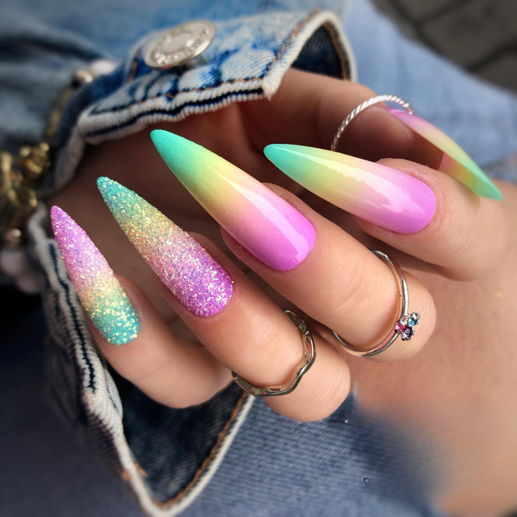 These nails, like a warm season twilight sky, are going from a pastel sunset to a sparkling night. The colors of the gradient are mixed with a sparkle overlay- the design is ideal for the summer evenings when the time is full of the promise of adventures. They are a source of motivation for any summer night event, best-combined with a chic evening dress and gentle sandals.
