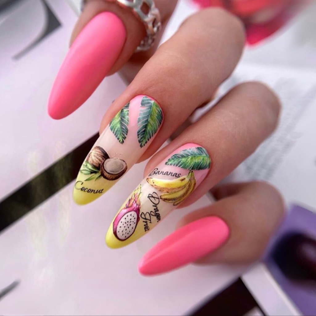 To say the least, these summer-themed nails serve as a homage to the exotic fruits of the hottest season. With illustrations of coconut, banana, and dragon fruits, these nails are an acknowledgment of the summer’s generosity. The soft colors of base pink and white make the combination of these nails and a summer dress or a cover-up look stunning yet easy.