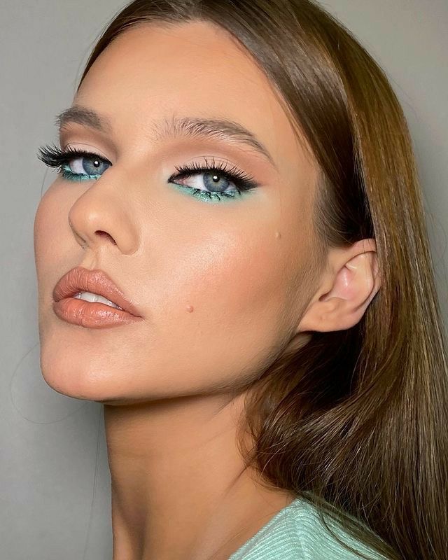 The combination of aqua green and winged liner really makes you feel summer’s coquetry. As this is a straightforward tutorial, it can help you create a look that is natural and light for blue eyes, but it can be completely the other way around by adding some elevated/extra details. The soft and simple nature of this makeup is an ideal idea for anyone wishing to project the effect of a sunny summer day.