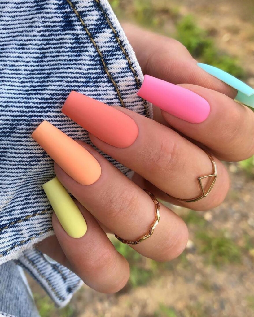 A discussion on color trends for 2024 cannot avoid the zesty pop of citrus orange and the tranquil blue of the summer sky. This audacious combination embraces a long square cut design, where each nail is covered in a distinct color mirroring the fashionistas versatility of the season. The union of matte and glossy textures not only brings about the presence of tangibility that enhances the experience of visual beauty, in fact, it becomes more interactive with your sense of touch. Wearing these nails that echo the summer of the year 2024 from a striking coral to a gentle sky-hued azure is a true homage to the free spirit.