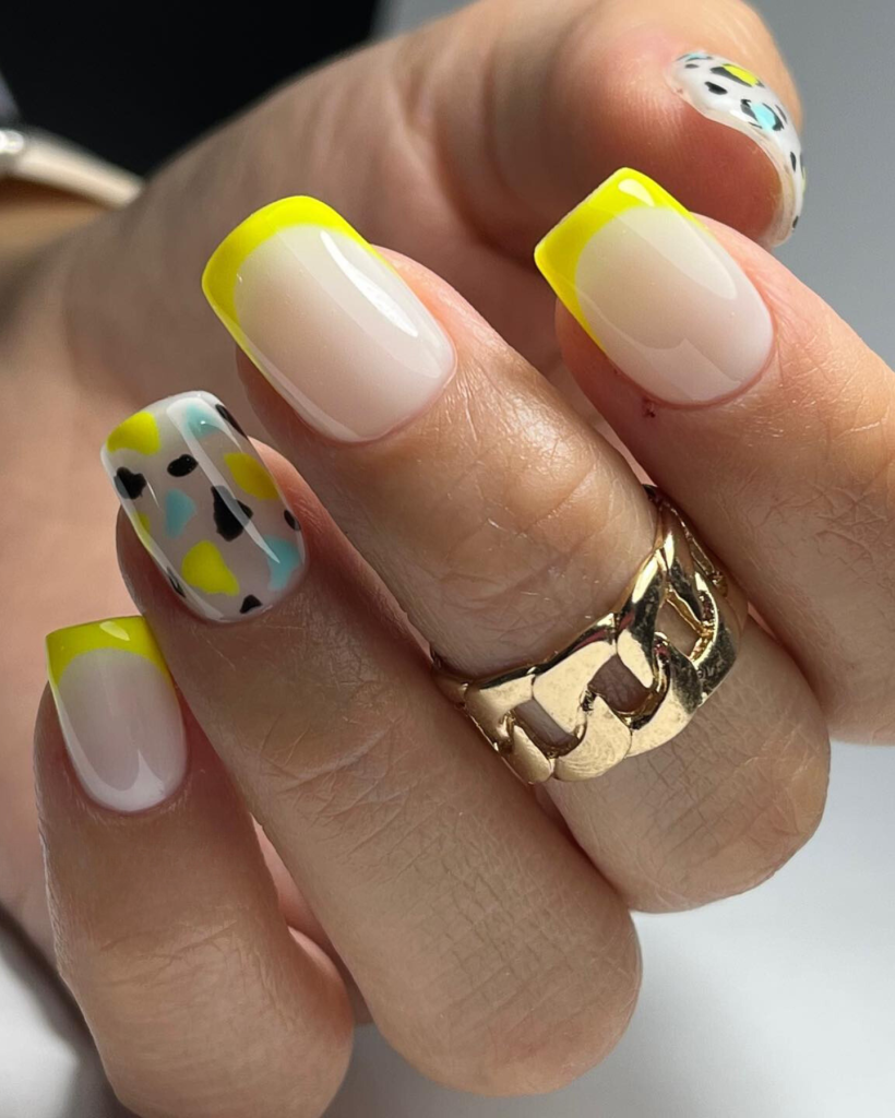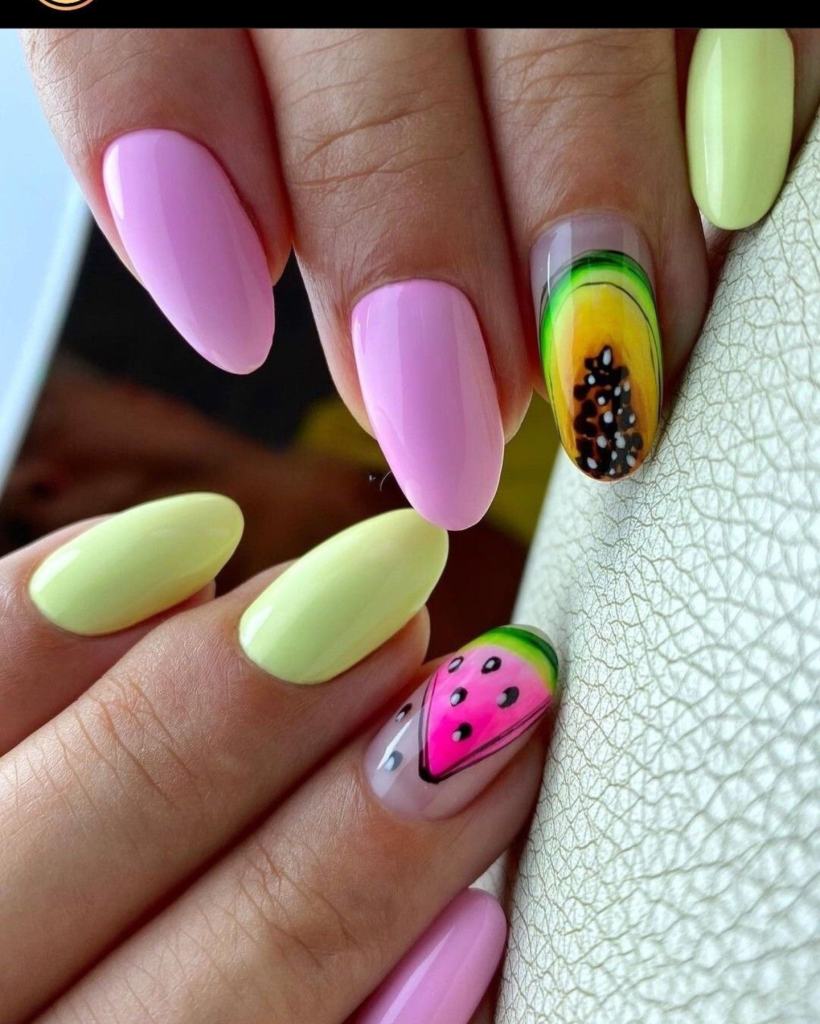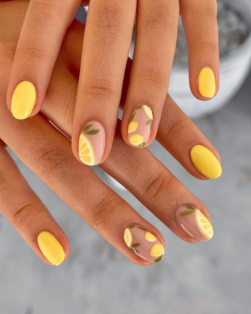 Here is a smart and fun variant of the traditional short nail, in which a set of nails are painted alternatingly in a bright yellow color and a transparent pink with lemon and leaf designs on them. This look is very elegantly and effectively casual and can match with places like a park on a sunny and lazy afternoon; thus, it is a perfect option for those who like to wear a trendy aesthetic, but with some elements of irony.