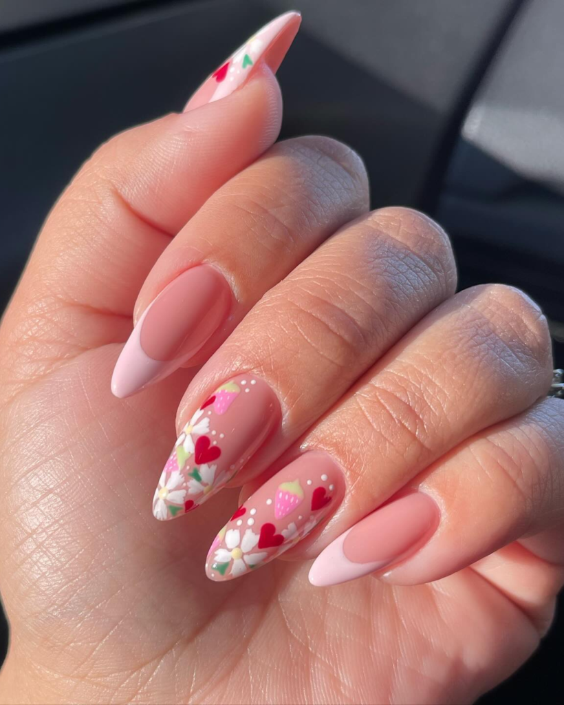 A realization of a strawberry and floral crop on a nail design during the summer nail trends 2024, besides, this is set against a background of soft pink color that is inviting. The long nails are holding complex designs that give an impression of a simple yet charming aesthetic. The visual of this style will suit perfectly garden parties or weekend picnics, and it would look to be ideal with floral prints or pastel colored outfits.