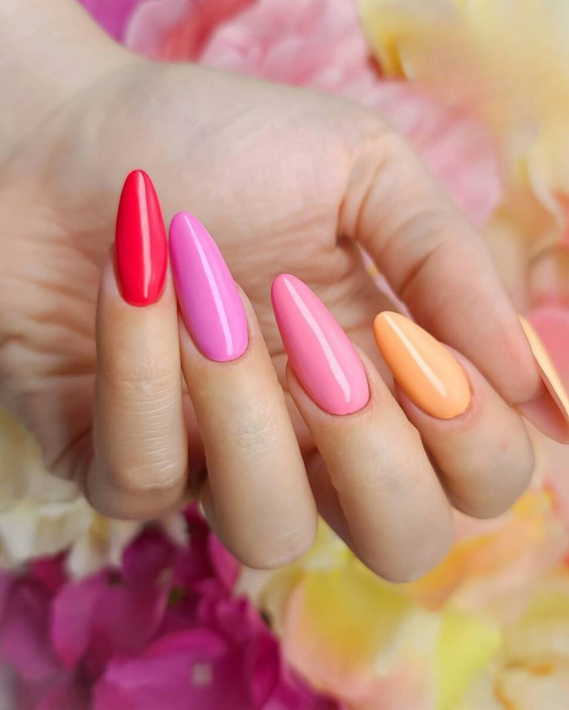 These salons are exquisite representations of the shade fads of 2024. The elongated, tapering almonds form is bathed in the sweet and bright colors such as a deep red, soft orange, and bubblegum pink. The mirror-like coating brings in an additional charm, thus making it a suitable style for both daytime and evening events. This is a perfect selection for the woman who likes adding elements of vibrancy to her outfit and has the courage to mix and master the bold, trendy tones.