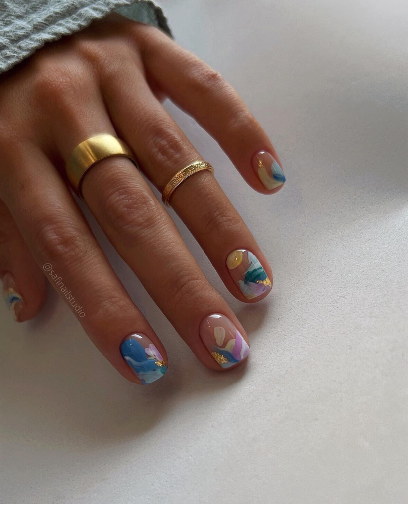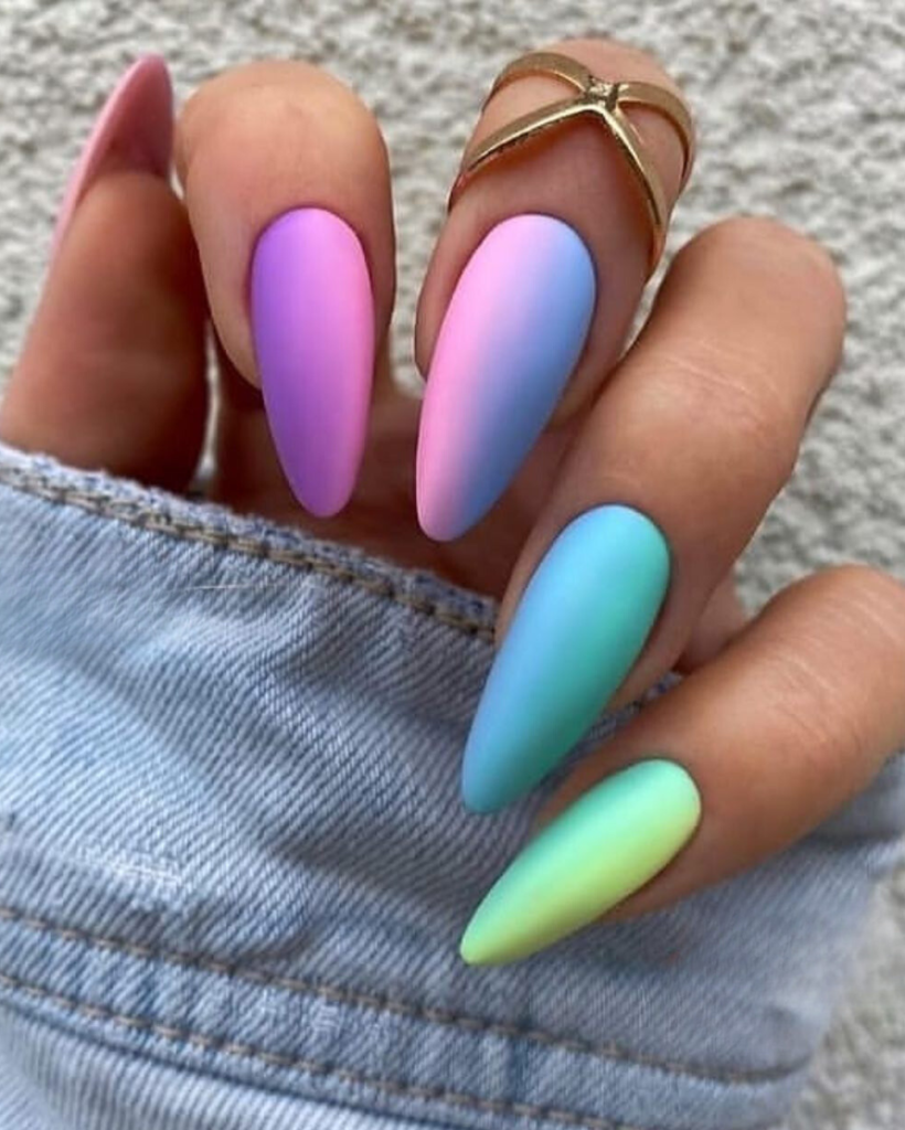 This nail design is a pastel lover’s dream. Five long almond – shaped nails are covered with a charming pastel shade gradient that perfectly matches each other from one finger to another. It appears from a soft lavender to a gentle sky blue, and down to a tender mint green, thus, its look is the expression of a power of a soft summertime sky. Such a touch is both easy and chic for anyone who wants to introduce the colors of 2024 into their summer color palette.