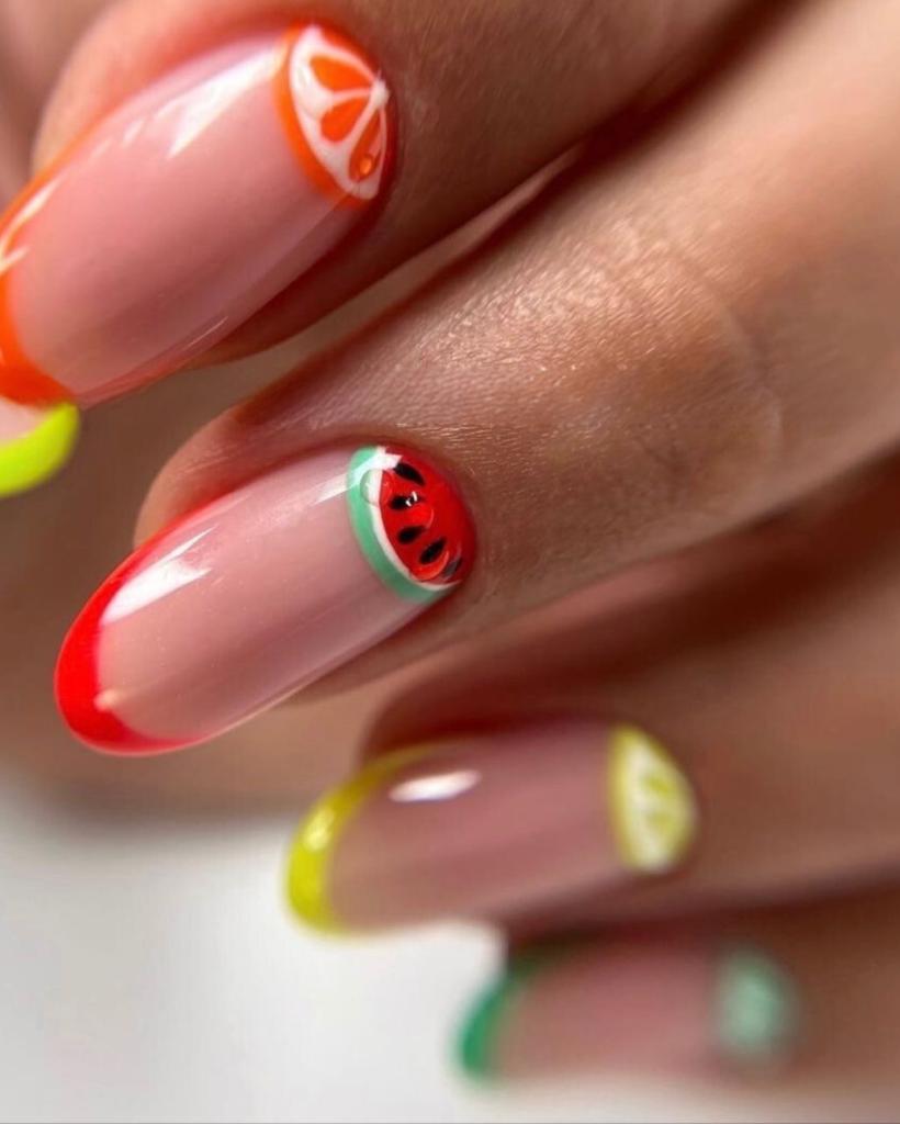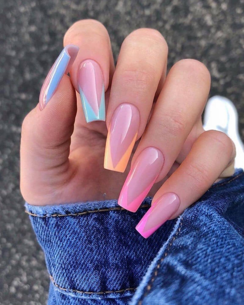 Show-stopper in jewel-toned tips and geometric designs, these nails are. A modern version of the French that they are, they have glittering gradients that go from bright pink to a fruity orange and then to a pear green. For those who want to add a touch of cocktail glamour to their summer evenings, this is the scheme.