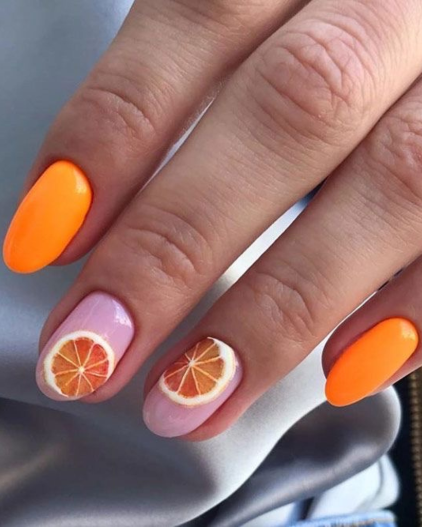 Taking it a step further, the color trends in 2024 reveal this one connecting the the ripe fruit lusciousness and the sheer polish sophistication. Long nails are painted in a juicy orange and accompanied by delicate citrus slice accents that provide a fresh and trendy look for any summer occasion.