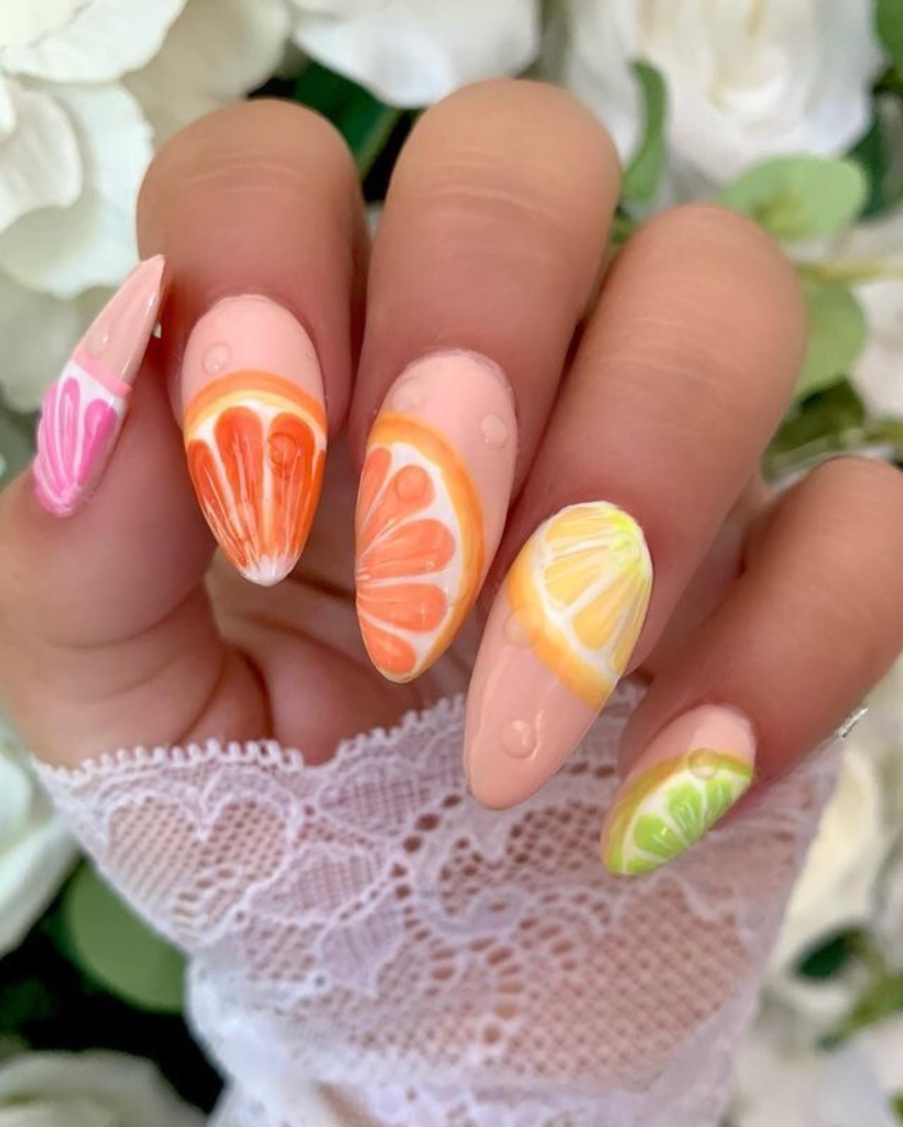 The colorful and fruit themed nail art is an indispensable summer item, and this pattern elevates it to a new height. Every nail is hand-painted the latest and different patterns showing a variety of citrus fruits, such as tangy oranges and zesty lemons, to a freshly squeezed fruit salad. The long nails are the best way to highlight the painting technique, and the latest pastel colors are an uncomplicated yet lovely addition. This style is suitable for a summer brunch or a sun-kissed day out.