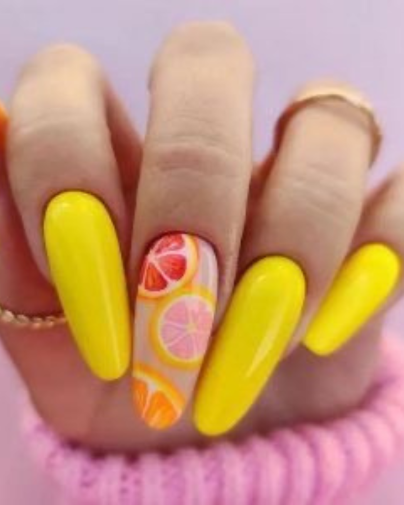 If you are a color pop lover, these nails are the actual representation of the summer vivacity. The long and striking nails are painted alternately in a yellow-orange that is matched with a fashionable matte lilac, and the two colors are each embellished with tiny fruit designs that resemble the real ones. Apart from the cute fruit designs, it is a popular acrylic look that displays both fun and quality making it a great combo not just with a bright summery wardrobe but also with a day filled with sun and smiles.