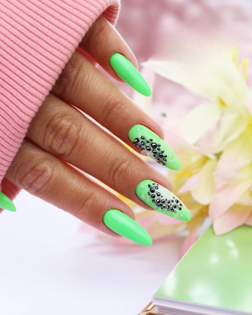 The summer of 2024 boasts some especially bright color trends, and this kiwi nail art style proves it. The flamboyant and bright green starting nail polish color is the immediate center of attention to the viewer; moreover, the kiwi seed description is the trendiest item of detail for the design. This is a popular design for women who have a sense of humor and are ready to draw attention to their nail art in an unusual way.