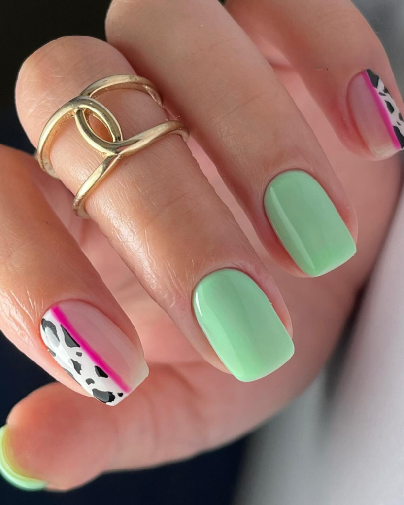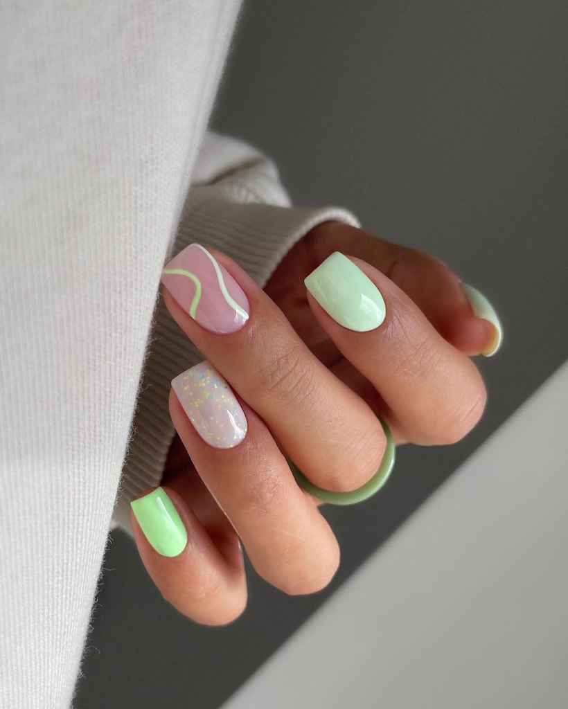 If it is the case that your choice is more to have a color range that is a bit subdued and yet trendy, your design is a minimalist combination of pastel colors with a touch of summer sparkle. The tiny nails each have an alternating coat of soft green and pink, and a fine glitter desired overlay that reflects the light in a lovely way. It is an uncomplicated and visual pick that reflects the summer trends of 2024, it is an ideal option for a rough yet elegant summer outfit.