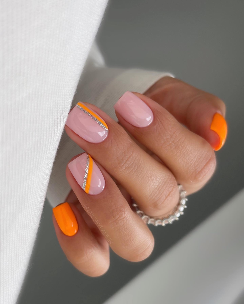 For the fashionistas wishing to flaunt their individuality, these nails are a perfect symbol of the lively shades of a summer sunset. A seamless transition from bright orange to a bare nude polish creates a modern and beautiful design, which is enhanced by a single glittering stripe for an extra elegance.
