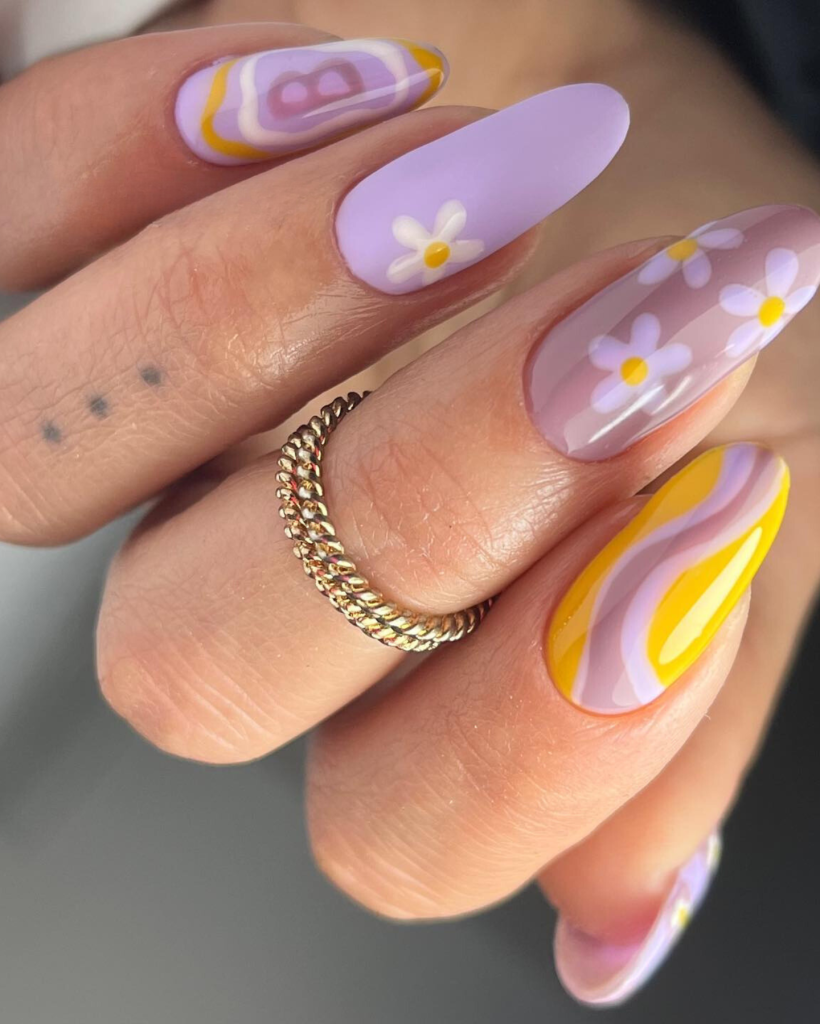 This cool design is a fashion fit for modern simple yet aesthetic summer wearing with a soft pastel and flower print combination. The shades of lilac and yellow are dear to the dawn sky and the long nails are a humble reference to the artist 2024.
