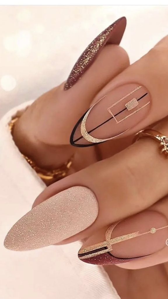 With a warm taupe almond nail, your embrace of spring’s earthy tones is perfect. The precise geometric accents make the design even more stylish. They are the ones on that trend to the woman who loves the fine art of detailing.
