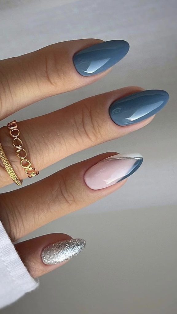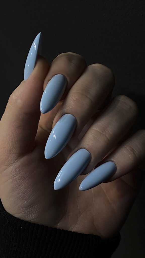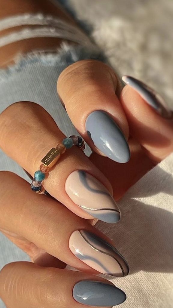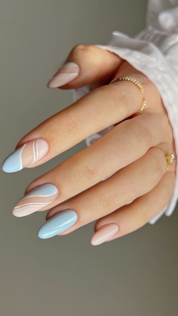 This soft blue almond nail design is like touching the serene sky of spring with your own fingers. The light-colored wave patterns that are added make it playful to the pastel blue base and therefore it reflects the beauty of the season very well.