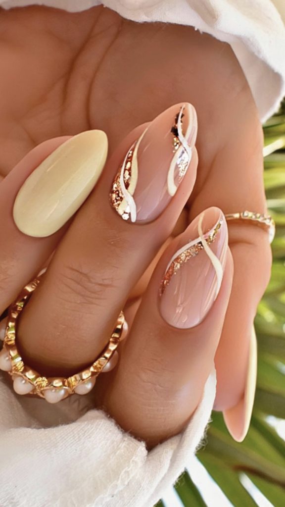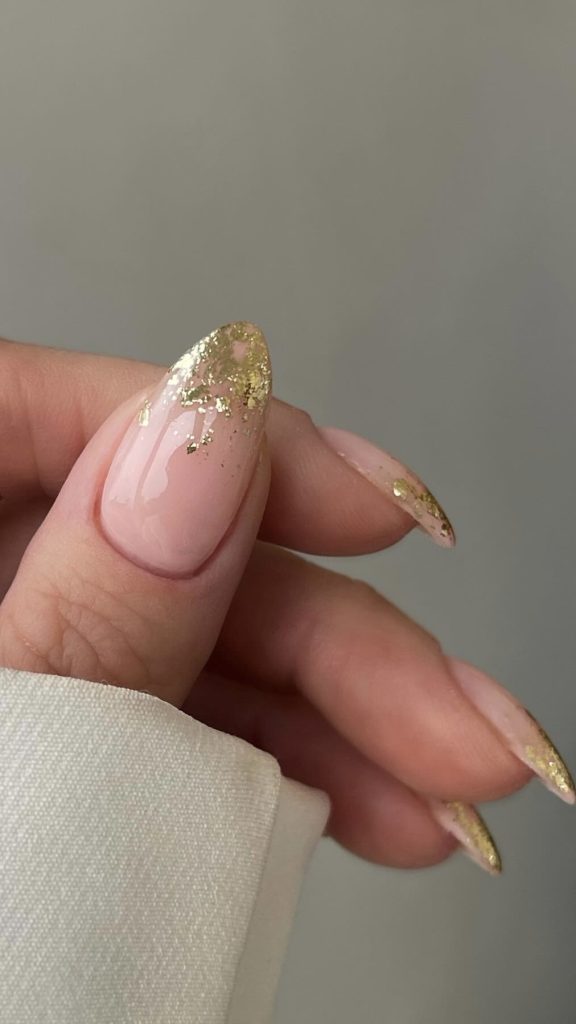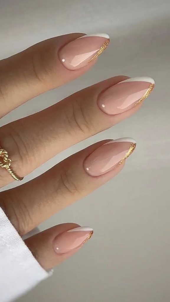 The fusion of nude polish and gold accents is the one that truly whispers to you about the ultra-modern and chic lifestyle. The nails are the perfect example of the absolute classic with an almond shape that enhances the beauty of the feminine hand. It is ideal for the fashionista who wants to be both elegant and up-to-date with the latest trends.