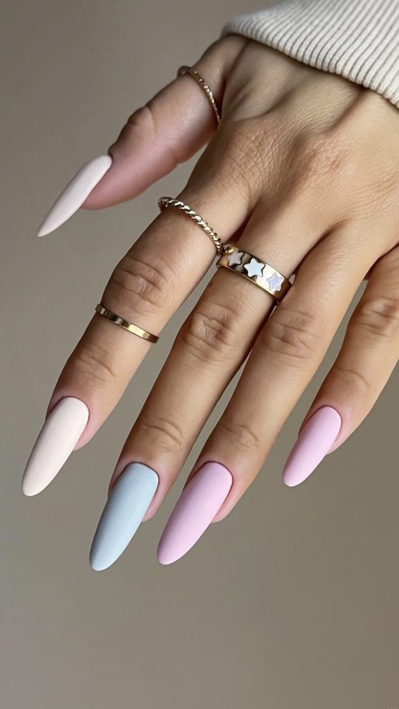 Spring is a great representative of pastel colors, and the nails shown are a true illustration of it. The sweet transition from sky blue to soft pink is similar to the morning of a new day. Besides, the almond shape is ideal for these gals who want to dream in colors and, of course, have a little bit of fun in their style.