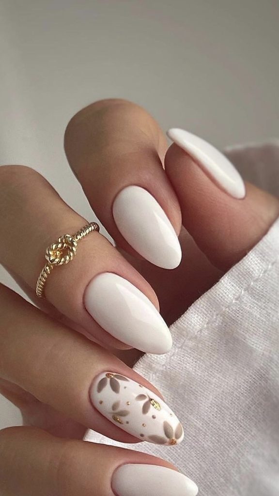 Nails with golden petal accents would be a wonderful way of feeling the thrill of the spring season’s arrival. The decoration featured here, has the soft gold leaves as an aspect. It conjures up the image of a soft flower covered with dew in the early morning.