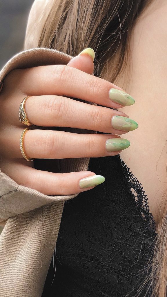 Green symbolizes new beginnings, and this nail model resembles the spring first flower growing from the ground. Transitioning from a light yellow to a fresh green is similar to the order of the season’s first sprouts, thereby, suggesting the different approach for the almond shape.