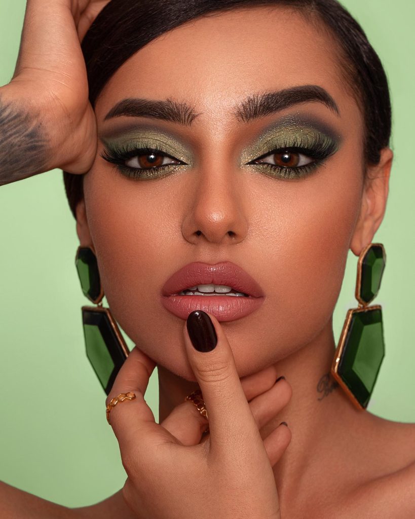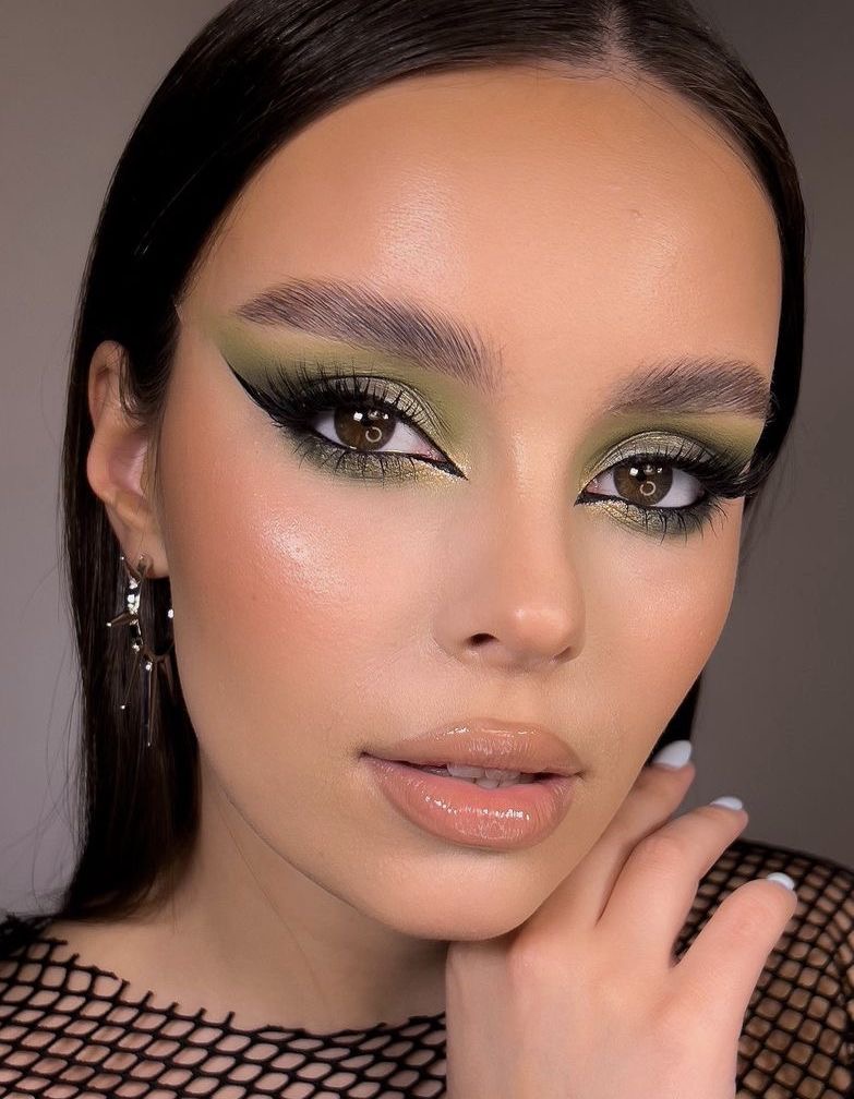 In this makeup look that is entirely devoted to olive tones, sophistication and earthliness are combined with a modern touch. The eyelids are covered with a gradient from olive to darker green, giving the look more depth and drama. This eye highlight totally suits the warm skin tone of a person and is perfectly matched with the matte nude lips for an overall elegant look. It is a suitable option for office attire as well as for any other occasion that needs a chic touch.