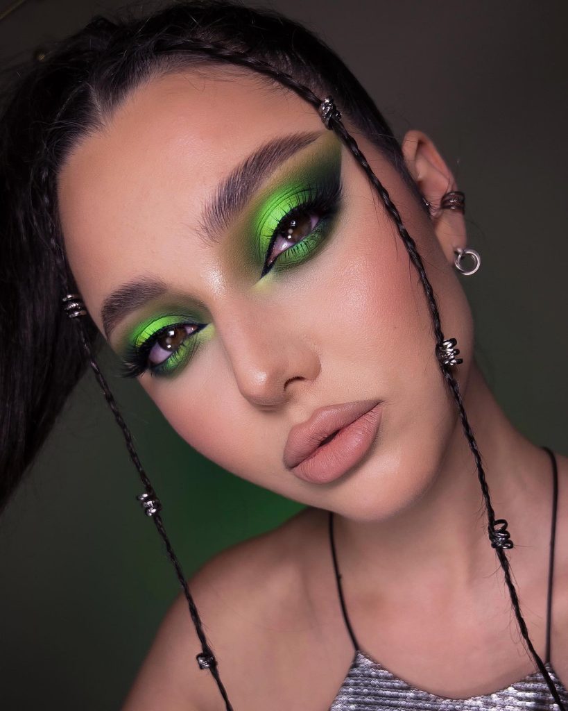 For the daring and the dramatic, this makeup style takes neon to new heights, blending it into a dark green base for a contemporary edge. Perfect for a fashion-forward prom or an electrifying night out, it’s a bold statement that resonates with confidence and modernity.